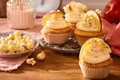 Für das Frosting Puderzucker in eine Schüssel sieben. 200 g Butter zugeben. Mix mit den Schneebesen des Rührgeräts cremig aufschlagen. Buttercreme-Frosting in einen Spritzbeutel mit großer Lochtülle füllen. Frosting als Tuffs auf die Muffins spritzen. Mit Zimt bestäuben. Muffins mit Karamell-Popcorn und je einem Apfelschnitz verzieren.