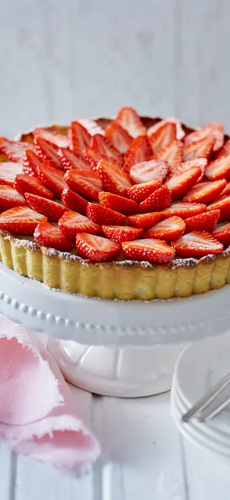 Erdbeeren waschen, putzen und halbieren. Creme glatt rühren, in die Tarte füllen und glatt streichen. Erdbeeren blütenartig mit der Rundung auf der Creme verteilen. Tarte bis zum Servieren kalt stellen. Vor dem Servieren mit Puderzucker bestäuben.