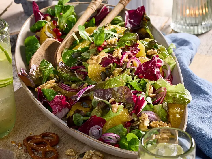 Für den Salat Kürbiskerne in einer Pfanne ohne Fett rösten. Auskühlen lassen. Feldsalat, Eichblattsalat und Radicchio waschen und in Stücke zupfen. Zwiebeln schälen, halbieren und in feine Spalten schneiden. Granatapfel halbieren und die Kerne herauslösen. Walnüsse grob hacken. Feldsalat, Eichblattsalat, Radicchio, Zwiebeln, Granatapfelkerne, Orangenfilets, Walnüsse und Senfdressing vermengen. Alpensalat mit Salz und Pfeffer abschmecken und anrichten. Kürbiskerne darüberstreuen.
