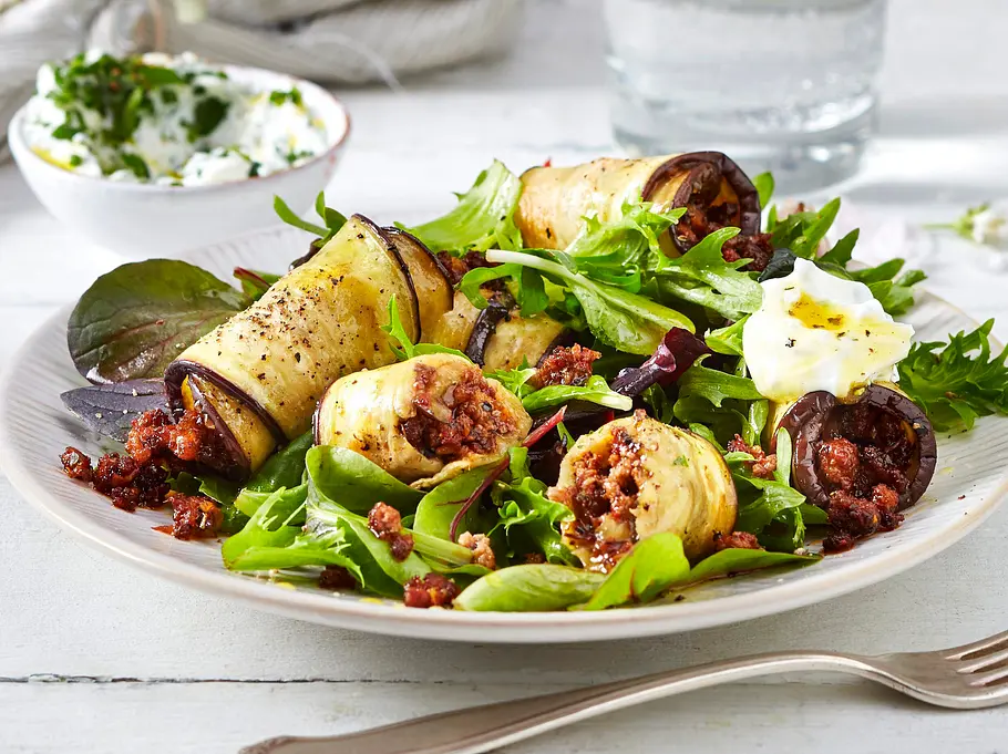 Ofenliebe pur: Auberginenröllchen mit saftigem Hack, frischem Salat und Kräuterquark – leicht, lecker und in nur 30 Minuten servierfertig