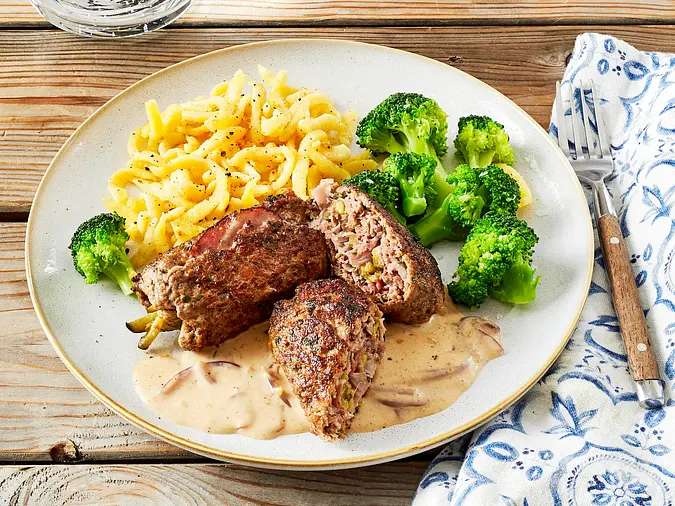 Übrige Zwiebel schälen, halbieren und in Streifen schneiden. Im heißen Bratfett anbraten. Mit Mehl bestäuben und anschwitzen. Mit Brühe und Sahne ablöschen, ca. 5 Minuten köcheln. Mit Salz und Pfeffer würzen. Brokkoli waschen, in kleinen Röschen vom Strunk scheiden. In kochendem Salzwasser ca. 5 Minuten garen. Spätzle in Butter ca. 5 Minuten anbraten. Mit Salz, Pfeffer und Muskat würzen. Rouladen mit Spätzle, Brokkoli und Soße anrichten.