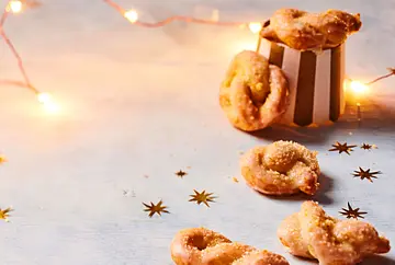 Walnussgroße Teigstückchen jeweils erst zu Röllchen, dann zu Kordeln und Knoten formen. Auf zwei mit Backpapier ausgelegte Bleche verteilen. Nacheinander im vorgeheizten Ofen (E-Herd: 180 °C/Umluft: 160 °C) 15–20 Minuten backen.