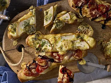 7 Laugenstangen mit Birne und Blauschimmelkäse belegen. Übrige Laugenstangen mit Tomaten und Salami belegen. Tomaten-Stangen zusätzlich mit Bergkäse bestreuen. Stangen nacheinander im vorgeheizten Backofen (E-Herd: 180 °C/Umluft: 160 °C) 18–20 Minuten goldbraun backen. Schnittlauch waschen und in Röllchen schneiden. Birnen-Käse-Stangen mit Schnittlauch bestreuen. Tomaten-Stangen mit Balsamico-Creme beträufeln.
