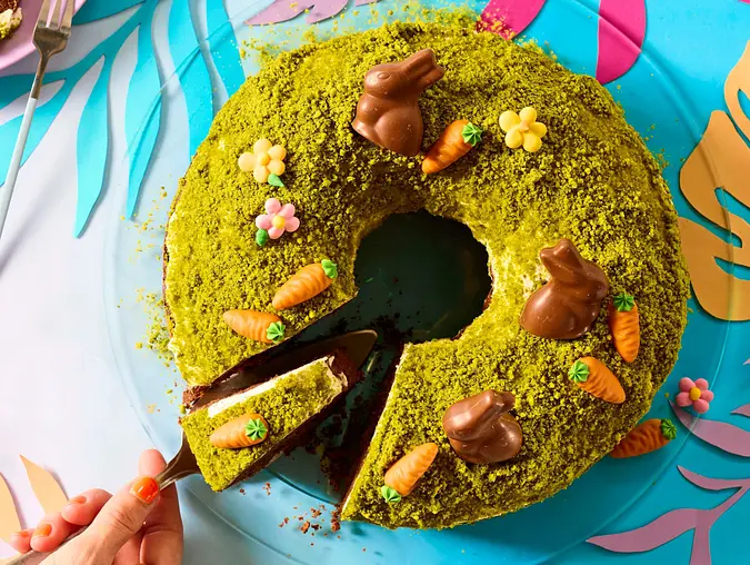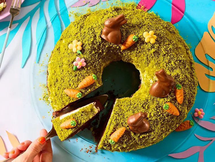Wir lassen die Naschi-Häschen auf einer Pistazien-Wiese hoppeln. Darunter versteckt sich ein saftiger Schoko-Marzipan-Kuchen mit Mandeln.
