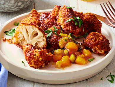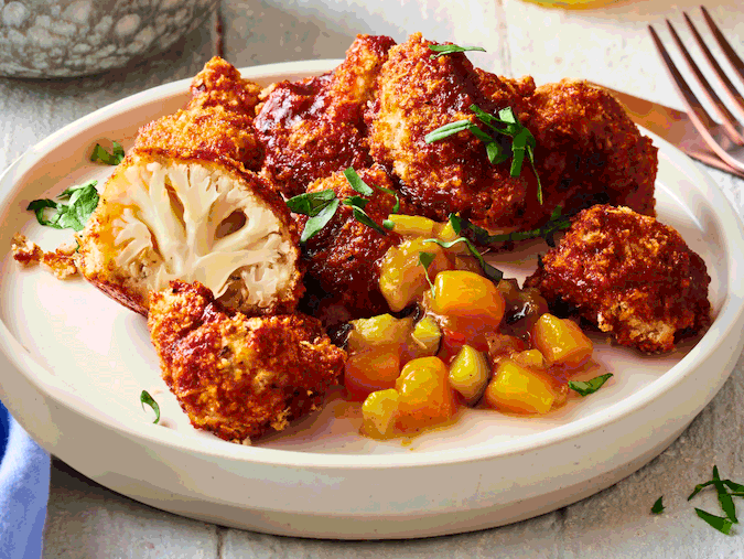 Mein neues Lieblingsessen aus dem Airfryer: Blumenkohlröschen in knuspriger, würziger Hülle mit herrlicher Barbecue-Glasur. Dazu passt Mango-Chutney, Sour Cream oder ein schneller Joghurtdip. Für alle, die es unkompliziert mögen: Das Chutney gibt es auch fertig zu kaufen.